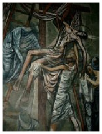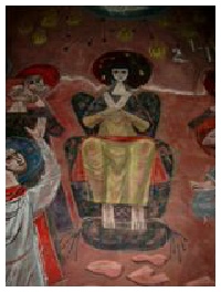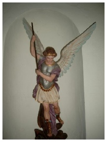 De wanden links en rechts van de hoofdingang zijn heel erg problematisch. Het bestaande stukwerk rondom de 2 schitterende tableaus van de annuntiata en moeder Maria met kind is helemaal verkankerd en moet als verloren worden beschouwd. De restauratie van de annuntiata zal niet al te problematisch zijn omdat het schilderwerk nog in goede staat is en de ondergrond nog samenhang vertoont. De restauratie van moeder en kind is veel problematischer. Veel pigmenten hebben losgelaten van de ondergrond en de figuratie verdwijnt hoe langer hoe meer tengevolge van de wisselende vochthuishouding in de ondergrond, waarschijnlijk te wijten aan de aanwezigheid van de buitentrap aan de buitenzijde van de muur waar voortdurend indringing van water plaatsvindt.