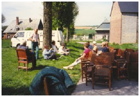 Vele vrijwilligers hebben weer gehoor gegeven aan de oproep om naar Jeantes te komen. Op 26 april 's middags komen Jo en ik aan om de steiger te bouwen rondom de poort van de cour van de mairie. Onze dames installeren zich weer in de zaal om de voorbereidingen te treffen voor de maaltijden. Ik heb inmiddels al van de burgemeester begrepen dat het koken door de gemeente geen haalbare kaart is, maar hij en zijn vrouw gaan geregeld met onze dames naar de hypermarche om de nodige inkopen te doen op rekening van de gemeente en de manden worden rijkelijk gevuld met spijs en drank. Weldra volgen de andere deelnemers en op zaterdagmorgen krioelt het van de deelnemers op de cour.