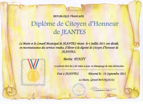 In juli belde de burgemeester mij op om me mede te delen dat de gemeenteraad van Jeantes had besloten om mij ereburger te maken van Jeantes en om bij de provincie Aisne een verzoek in te dienen om mij de medaille d’honneur van het département Aisne te verlenen.