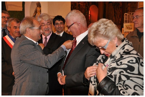 Peter speld Harrie en Jacqueline de medailles op van Beschermheer en beschermvrouwe van de vrijwilligers in Jeantes.