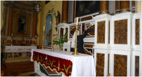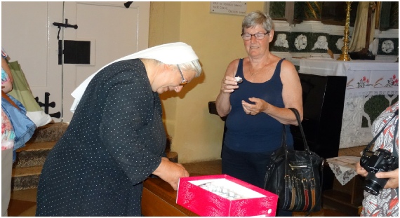 De kapitein, gids, burgemeester neemt ons mee naar zijn kerk. In het Engels vertelt hij zijn levensgeschiedenis.