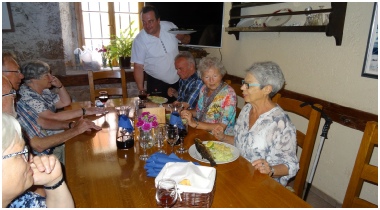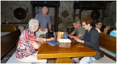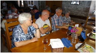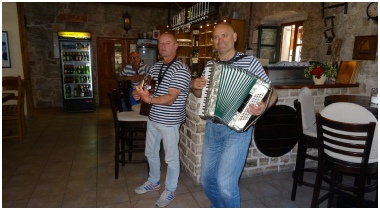 Na dit bezoek brengt onze gids en chauffeur Renee ons naar het restaurant, waar een grote vis ligt te wachten en mixid-grill. Glazen worden gevuld en twee muzikanten Jozef (trekzak) en Thomas (guitaar) - proberen met hun volksmuziek wat sfeer te brengen, wat hun ook prima lukt.