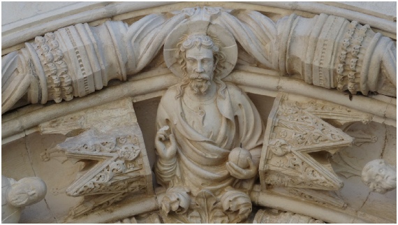 De mooi bewerkte Timpaan van de Jacobuskathedraal.