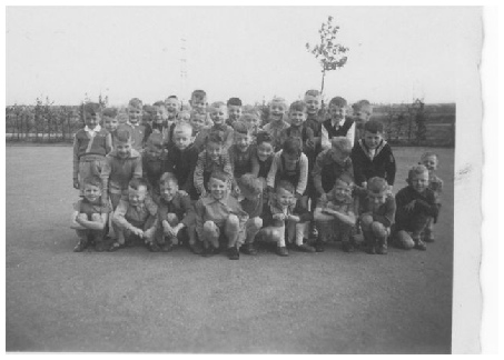 S7. Bewaarschool Neerbeek; bovenste rij, o.a.: dochter van Herman Zenden; 2e rij: 6 van links Tiny Spronken; 3e rij: 6e van links Math Dols, geheel rechts Twan van der Linden; 4e rij: Elly en Mia Hamers, Mia Peters, Teneij; voorgrond: links Willy van Uden, met beiden handen op de knieen Harie Pinxt; 1942