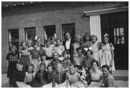 S19. Meisjesklas gefotografeert op de speelplaats van de oude school (jongensschool) te Neerbeek; o.a.: Limpens, Tiny Vroomen, Annemie Reijnders, Ummels en Verjans; 1955