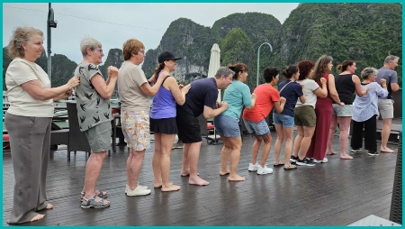 S' morgens om 06.00 uur stonden wij op en werden om 06.15 uur verwacht boven op het dek voor de ochtend gymnastiek.