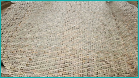 De ambachtslieden creëren een basisframe door bamboestokken te weven tot een grote, platte mat. Dit vereist veel vaardigheid en precisie.
